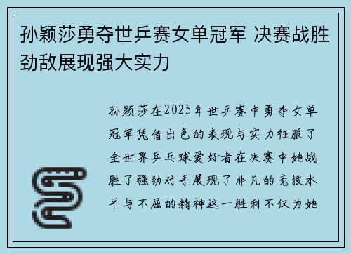 2025年,孙颖莎在世界乒乓球锦标赛上以绝对优势横扫对手,成功夺得女单冠军,创造了她职业生涯的又一新高峰。她以其出色的技术、稳定的心理素质和强大的竞争力,成为了世界乒坛的焦点。这一冠军不仅是她个人职业生涯的辉煌时刻,也标志着中国乒乓球队在国际乒乓球领域的强大实力。孙颖莎的夺冠之路,虽然充满挑战,但她凭借着精湛的技艺和坚韧不拔的意志力,最终站上了最高领奖台,书写了属于她自己的传奇。本文将从孙颖莎的技...