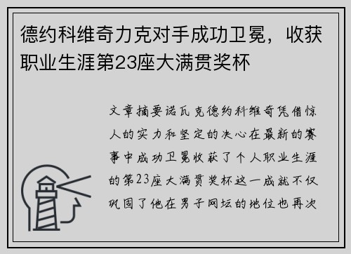 文章摘要:诺瓦克·德约科维奇,这位塞尔维亚网球天王,凭借着出色的竞技状态和非凡的毅力,在男子网球历史上创下了举世瞩目的纪录——连夺多个大满贯冠军,成为历史上最具统治力的网球选手之一。文章从四个方面详细阐述了德约科维奇打破男子网球纪录的辉煌历程:首先,他如何不断挑战自己的极限,赢得历史性的大满贯;其次,德约科维奇在大满贯赛事中的统治地位和卓越表现;接着,探讨了他如何突破身体极限,保持长时间的巅峰状态...