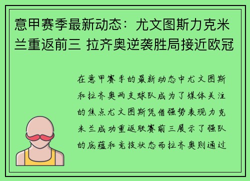 在即将到来的意甲联赛新赛季中,尤文图斯与国际米兰将展开一场激烈的巅峰对决。这两支意大利足球的豪门球队都渴望争夺冠军,展开一场无情的较量。从球队实力、战术布置、球员状态到历史背景,各方面的因素都将在这一赛季的竞争中发挥至关重要的作用。尤文图斯在经历了一系列的调整后,重整旗鼓,誓要恢复其霸主地位,而国际米兰则在上一赛季的稳定表现基础上,继续扩充阵容,力图挑战尤文图斯的统治地位。本文将从四个方面深入分析...