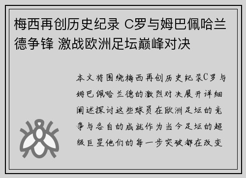 本文将详细探讨法国足球巨星基利安·姆巴佩(Kylian Mbappé)在足坛的辉煌表现及其为巴黎圣日耳曼(PSG)带来的全新辉煌时刻。作为当今世界足坛最具影响力的球员之一,姆巴佩不仅在个人层面屡创佳绩,更在团队协作中展现出了卓越的领导力和技术水平。他在巴黎圣日耳曼的表现,既是一种个人成就的体现,也代表着俱乐部的新辉煌。本篇文章将从四个方面详细分析姆巴佩的历史纪录及其对巴黎圣日耳曼未来的深远影响。首...